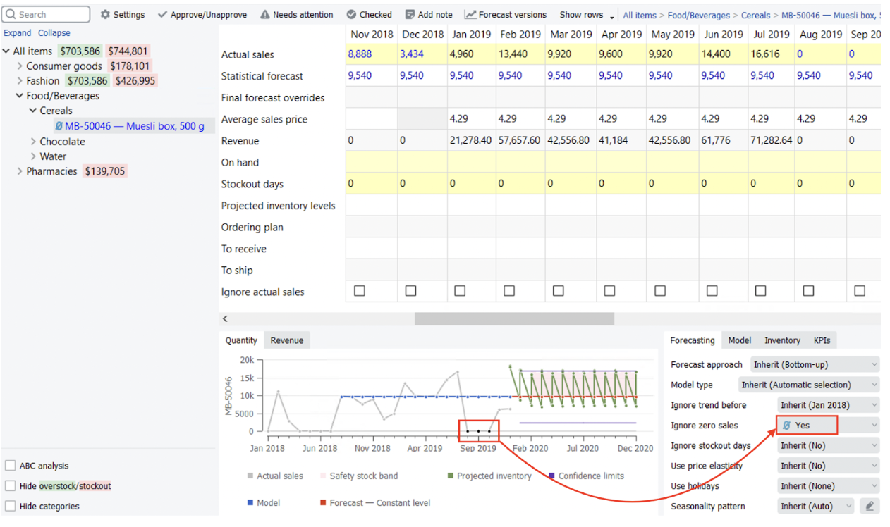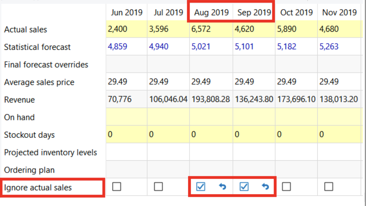 To use the feature, go to the Demand tab and find the row Ignore Actual Sales in the Table. Then, check the boxes to select the needed periods.