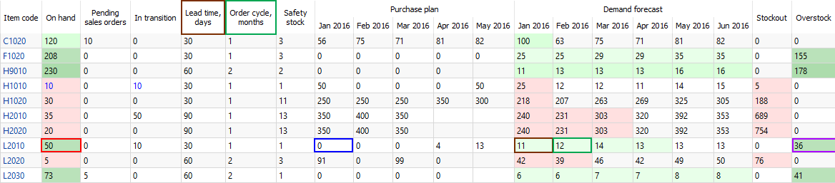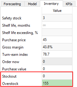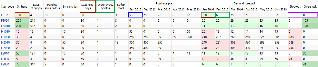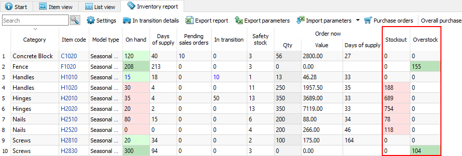 • Zero values and no color background in the Stockout and Overstock columns.