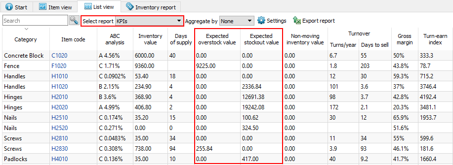 You can view expected overstock or stockout value on an item basis or for all of the items in one report.