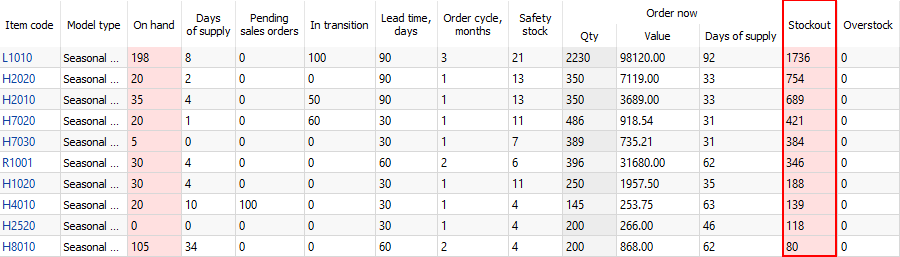 • Corresponding cell of the On hand and Stockout columns has a red background.