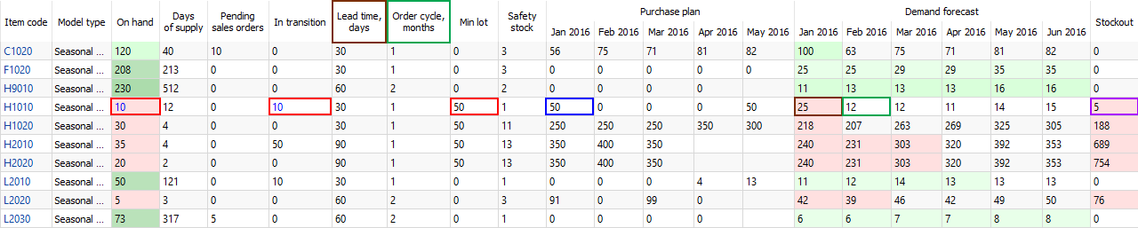 • The future periods which demand can’t be covered by the On hand + InTrn(LT)PndSales(LT) quantity have a red background in the Demand forecast section.