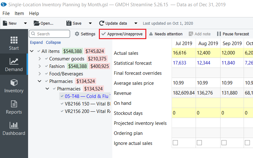 Remove this page from your book Streamline has an Approval horizon feature, which allows you to lock a given amount of time periods, so no changes to the demand plan can be made. The described locking mechanism is designed to freeze the state of the final demand forecast for a chosen amount of time while different company’s departments (sales, financial, marketing, etc.) are checking them or for the lead time period.