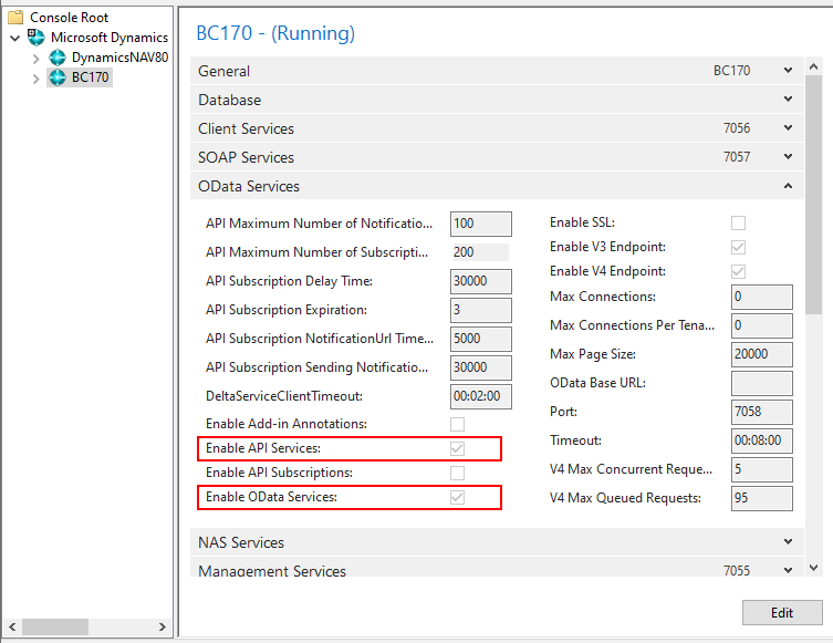 3. Expand the OData Services section on the right and check out if Enable API Services and Enable OData Services settings have checkmarks (see figure below).