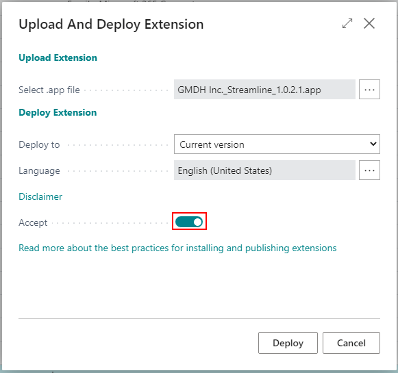 7. Set the option Accept enabled and click the Deploy button (see figure below).