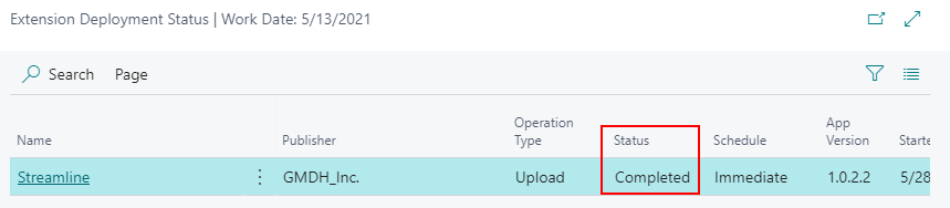 7. Deploying of an extension typically takes several minutes. You can track the deployment status of the extension by going to the menu Manage > Deployment status of the extensions page. The Extension Deployment Status window appears. If the Status is Completed for the extension, you can start using this connection (see figure below).