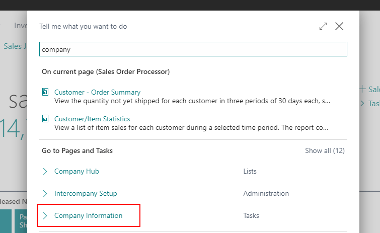 3.2. Click on the search icon in the right-top corner and type 'company' in the search bar. Then, select the Company information option from the search results (see figure below).