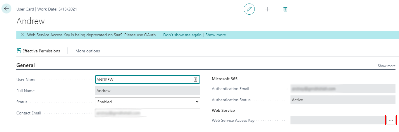 If you use the Cloud version of Business Central, a Web Access Key is used as the password. To generate such a key for a user, do the following: