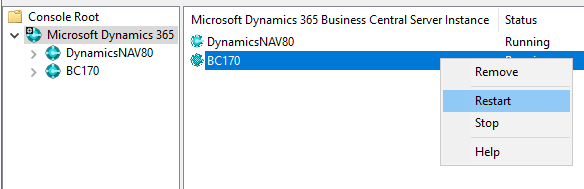 5. After that, select the root node in the tree, right-click on the Business Central instance, and select the Restart command from the context menu (see figure below).