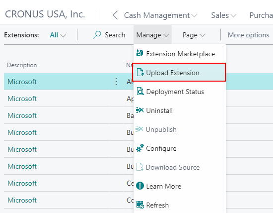 4. Click Manage in the second-line menu, then select the Upload Extension command (see figure below).