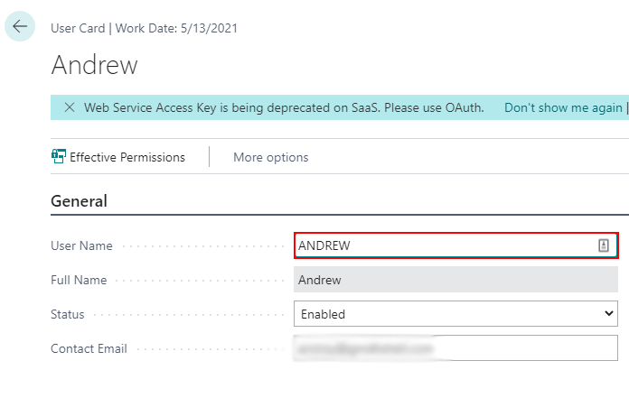 4.1. Open User Card of the user you want to grant access to the Web Services. The value of the User Name field is the one you need to provide in the connection dialog (see figure below).