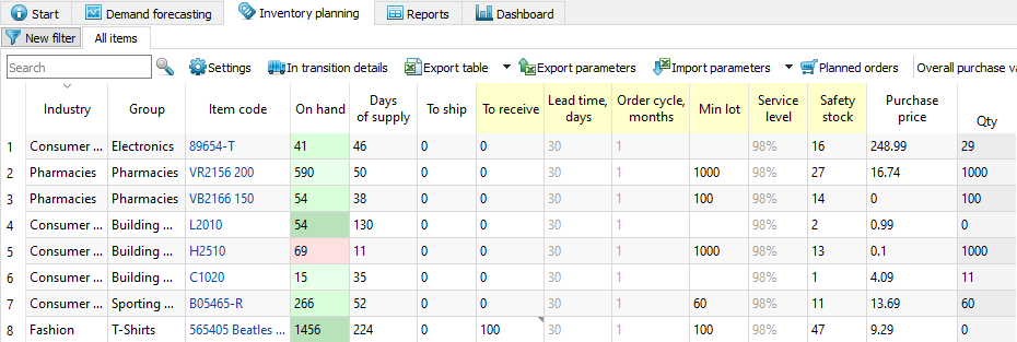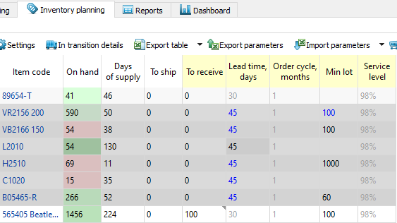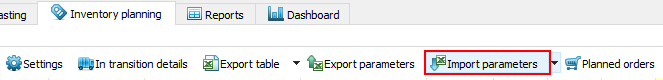 Now, let's go to the Inventory planning tab to see the imported replenishment parameters (see figure below).