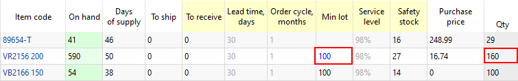 In our example, we have changed the Min lot from 1000 to 100 for item VR2156 200 (see figure below).