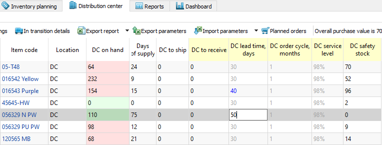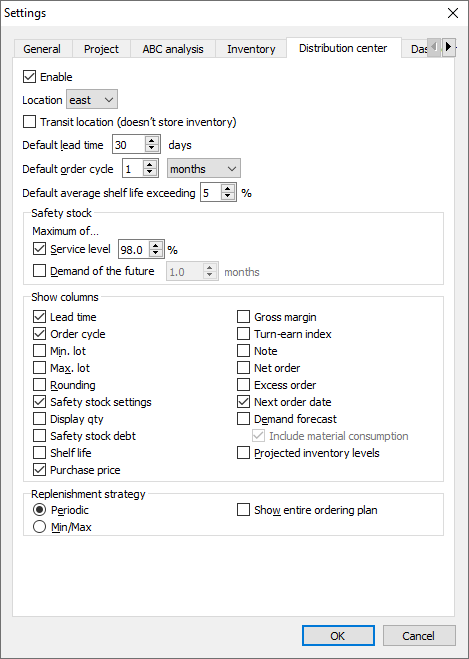 Distribution center tab provides the same possibilities to modify replenishment parameters as Inventory planning tab does (see figure below).