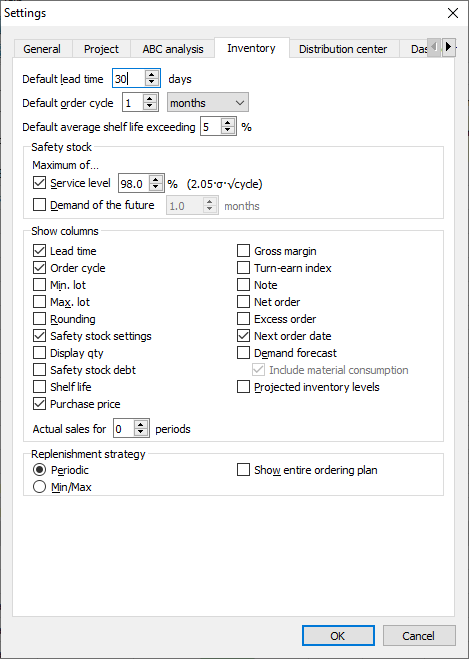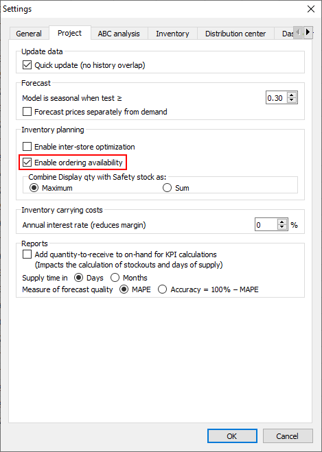 Assume, our supplier can't take orders in January and February of 2019 for this product. To set these constraints, we go to the menu File > Settings > Project tab and check the Enable ordering availability option (see figure below).