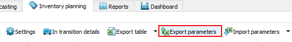 To get replenishment parameters imported correctly from an Excel file, we should know the format of the file that Streamline understands. To find out the file format, click the Export parameters button on the toolbar (see figure below).