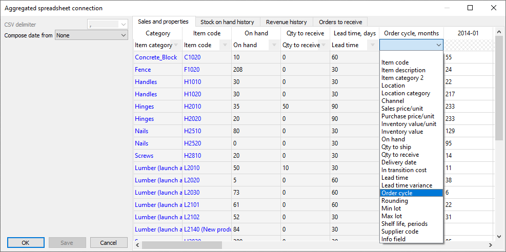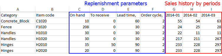 As you see here, the file contains the following replenishment parameters as On hand, Qty to receive, Lead time, Order cycle.