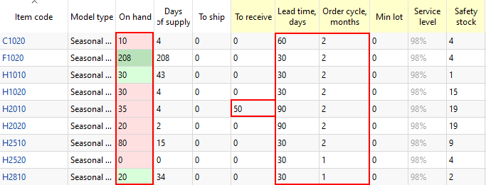 There is a minimal limitation on the Horizon parameter when you are planning your inventory. The Horizon should be at least as long as the longest Lead time and Order cycle combination. For example, if the longest Lead time is 2 months and the longest Order cycle is 3 months, then the Horizon should be at least 5 months.