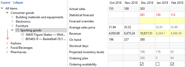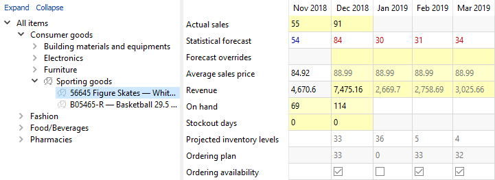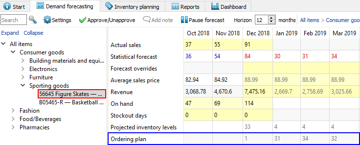 Let's illustrate this using an example. We open the built-in example Inventory planning by month, go to the Demand forecasting tab, and select the Figure skates product under the Sporting goods category in the tree (see figure below).