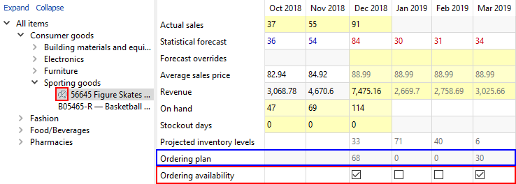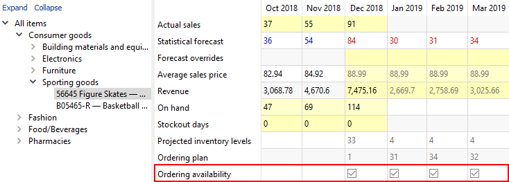 Assume, we need to set up ordering availability constraint at a category level, for example, for all sporting goods. To do this, we click at this node in the tree and disallow ordering, for instance, for January 2019 (see figure below).