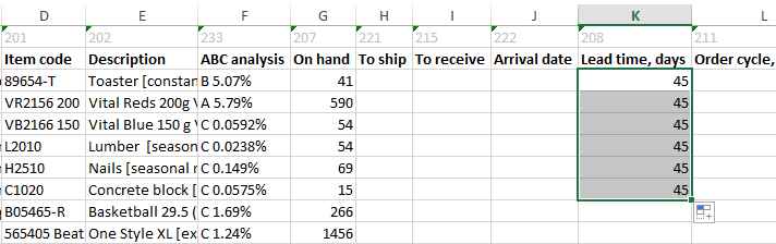 Now, you can use the newly created file as a template to fill your parameters in there. As an example, we set up the Lead time to 45 days for the first six items (see figure below).