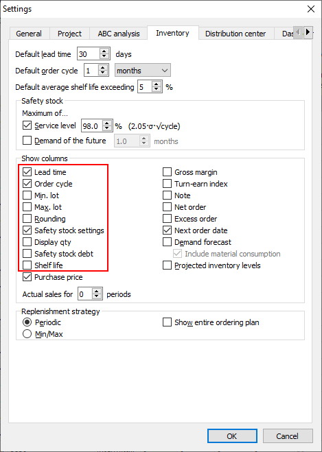 By default, inventory reports show columns for only those replenishment parameters that were imported from your data source. However, you can include all the available parameter by changing the display settings of the report. To do this: