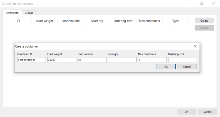Containers work as a rounding value and can be defined by load weight, volume, or quantity. You’re also able to specify the ordering cost of the container ( needed for EOQ calculations) and maximum number of containers that can be ordered from a supplier at a time.