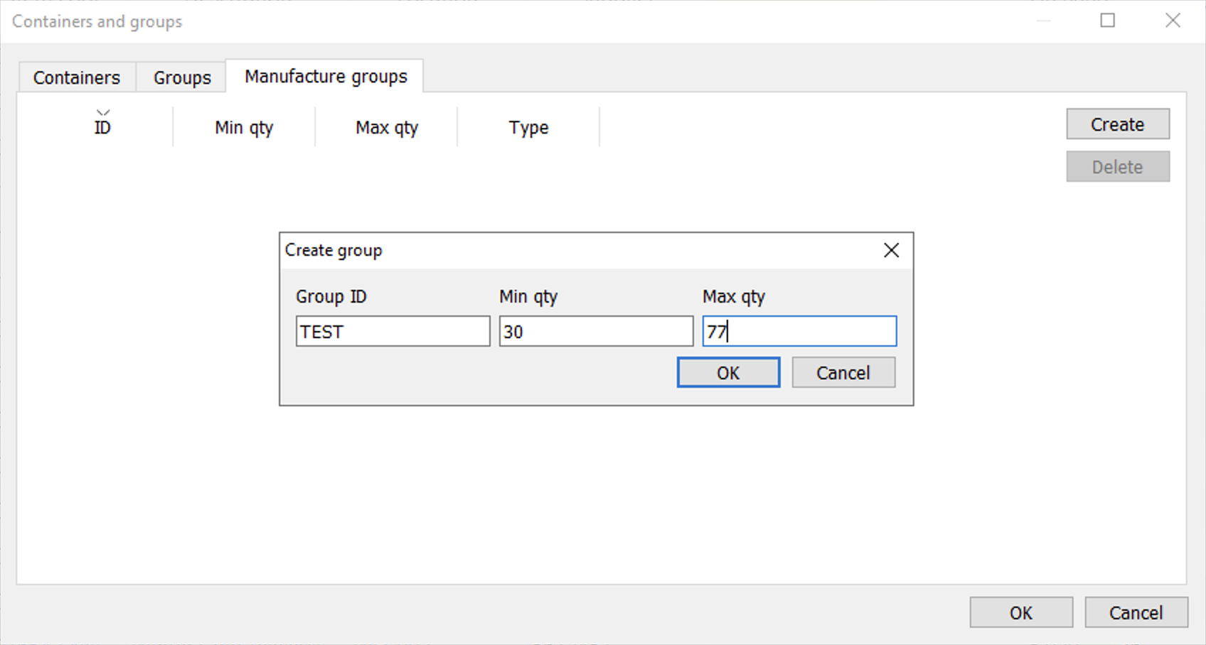 Essentially, the Manufacture groups feature is related to working with manufacturing lines. Users can create Manufacture groups in the Containers and Groups dialog and set Max qty / Min qty for them. After that, they can be set for the finished items only, and the set group restrictions will be applied to manufacturing orders.