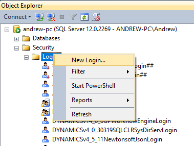 2. In the Object Explorer window expand the Root element (your server) > Security > Logins. Then, right-click at the Logins node and select the New Login… command from the context menu (see figure below).