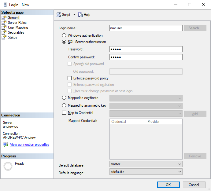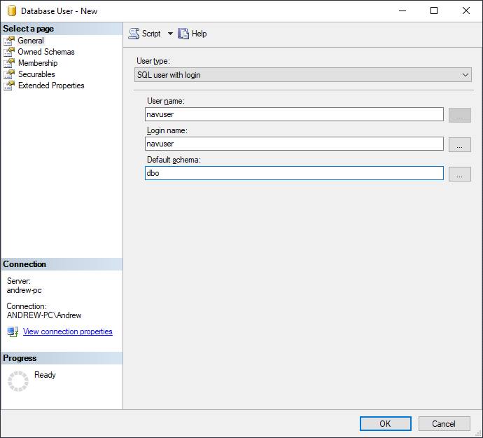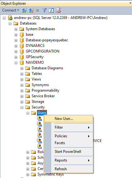 4. Add a new user to the database based on the newly created login. In our example, we are creating a new user for the Microsoft Dynamics NAV database.