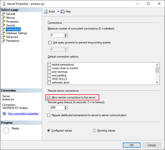 5.3. Go to the Connections page and check the Allow remote connections to this server option (see figure below).