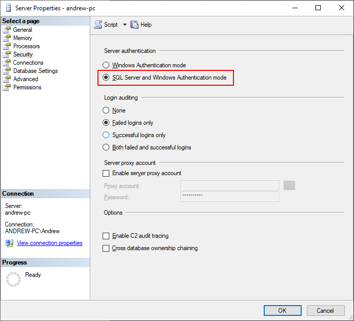 5.2. Go to the Security page and select the SQL Server and Windows Authentication mode (see figure below).