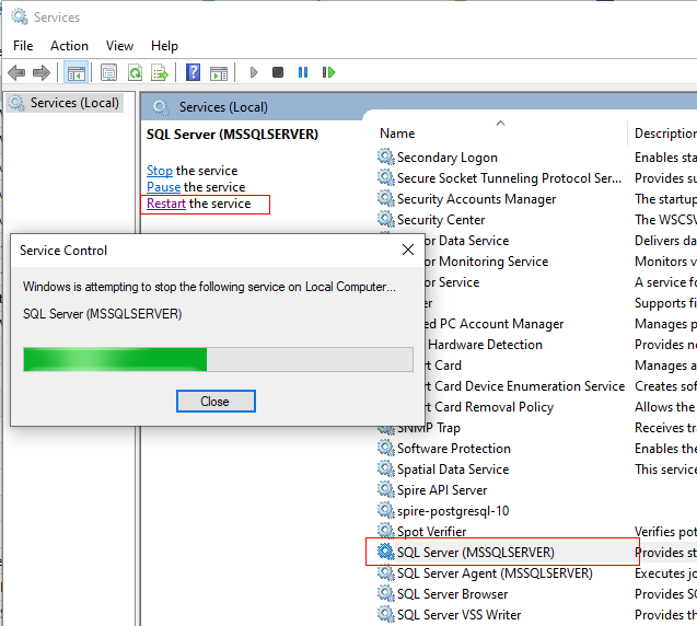 6.2. Find the SQL Server service and click the Restart link found in the left-top corner of the window (see figure below).