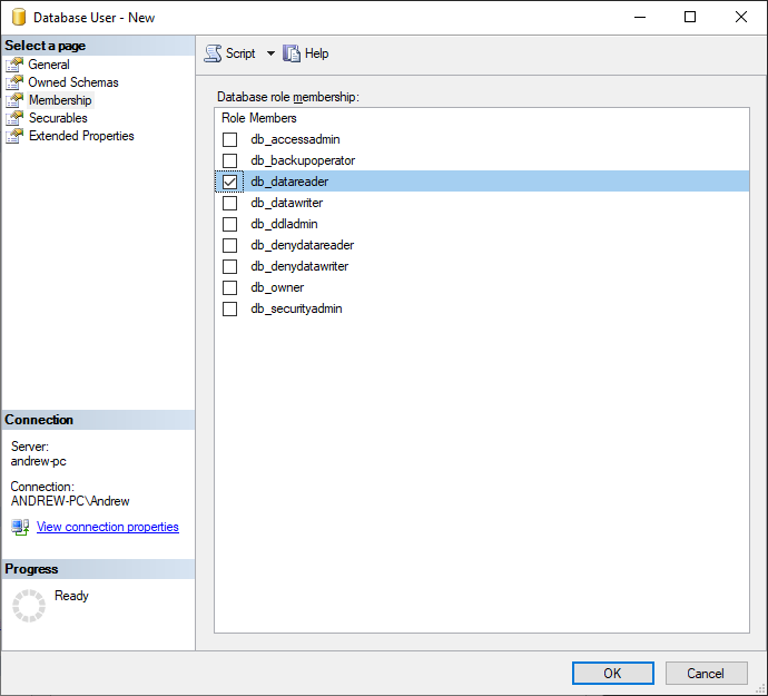 4.7. Go to the Membership page and select the db_datareader option (see figure below).