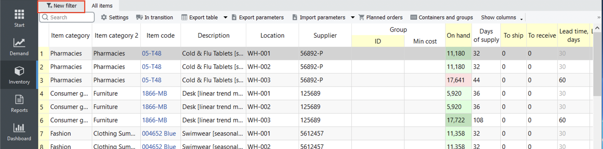 You can create custom reports on the Inventory planning, Inter-store optimization, Distribution center, or Report tab. Depending on the tab, the set of columns used in filtering expressions differs.