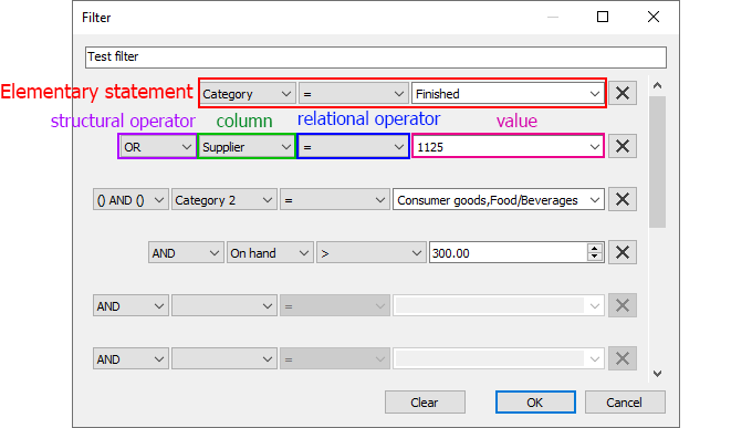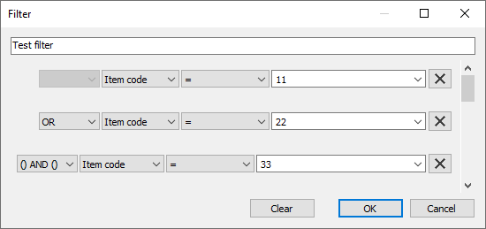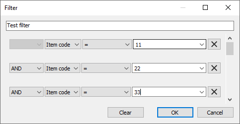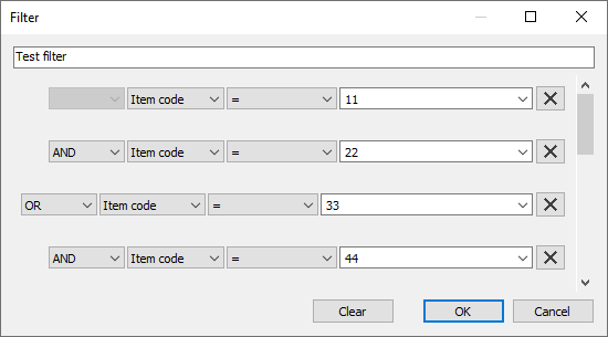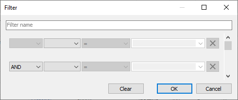 Each line below the Filter name field is used to build an elementary statement. The X button at the end of each line clears the corresponding condition.