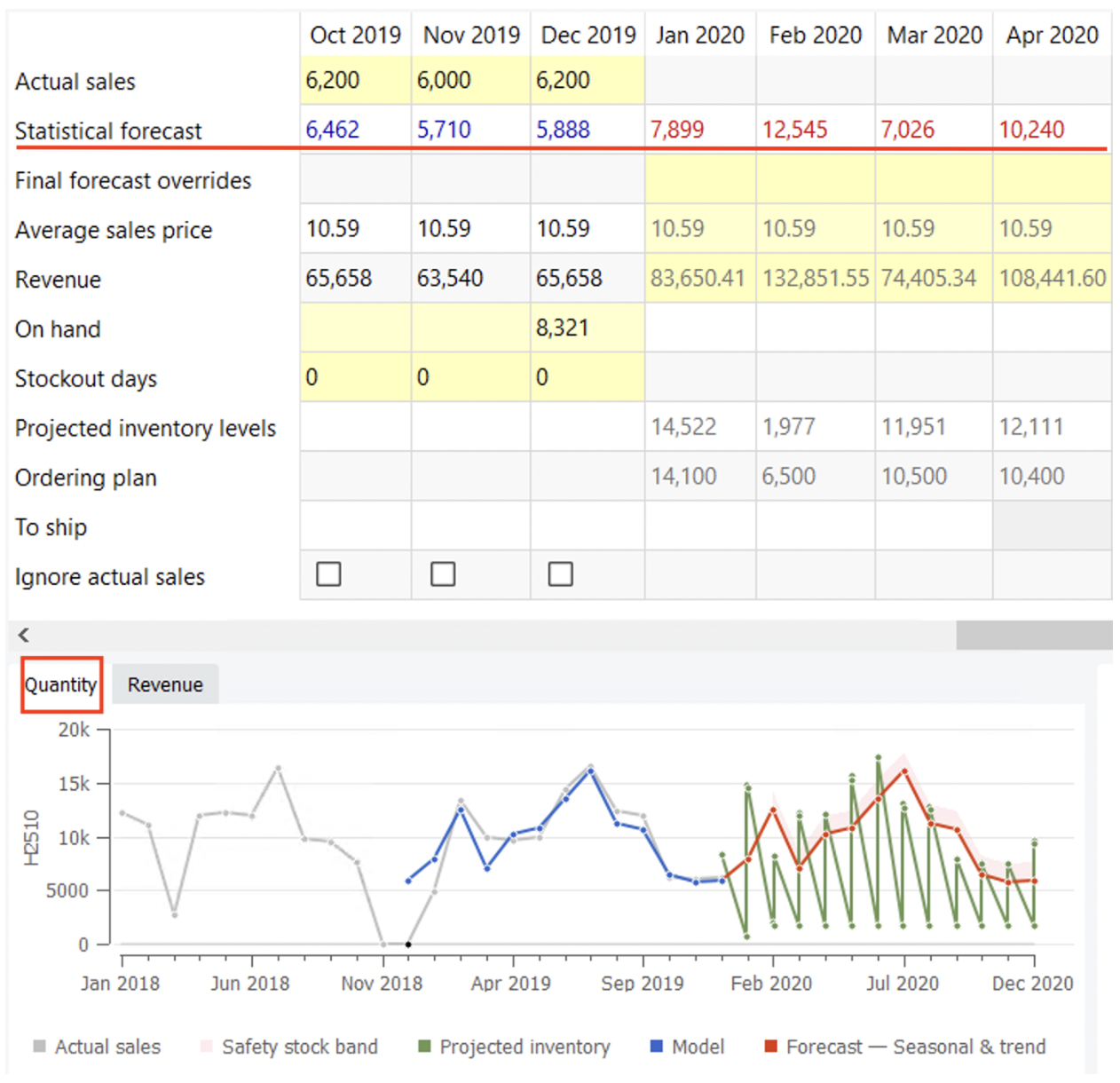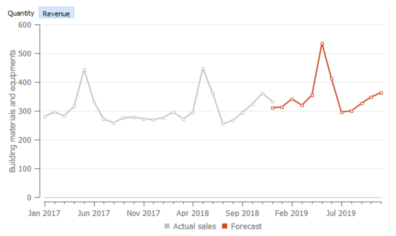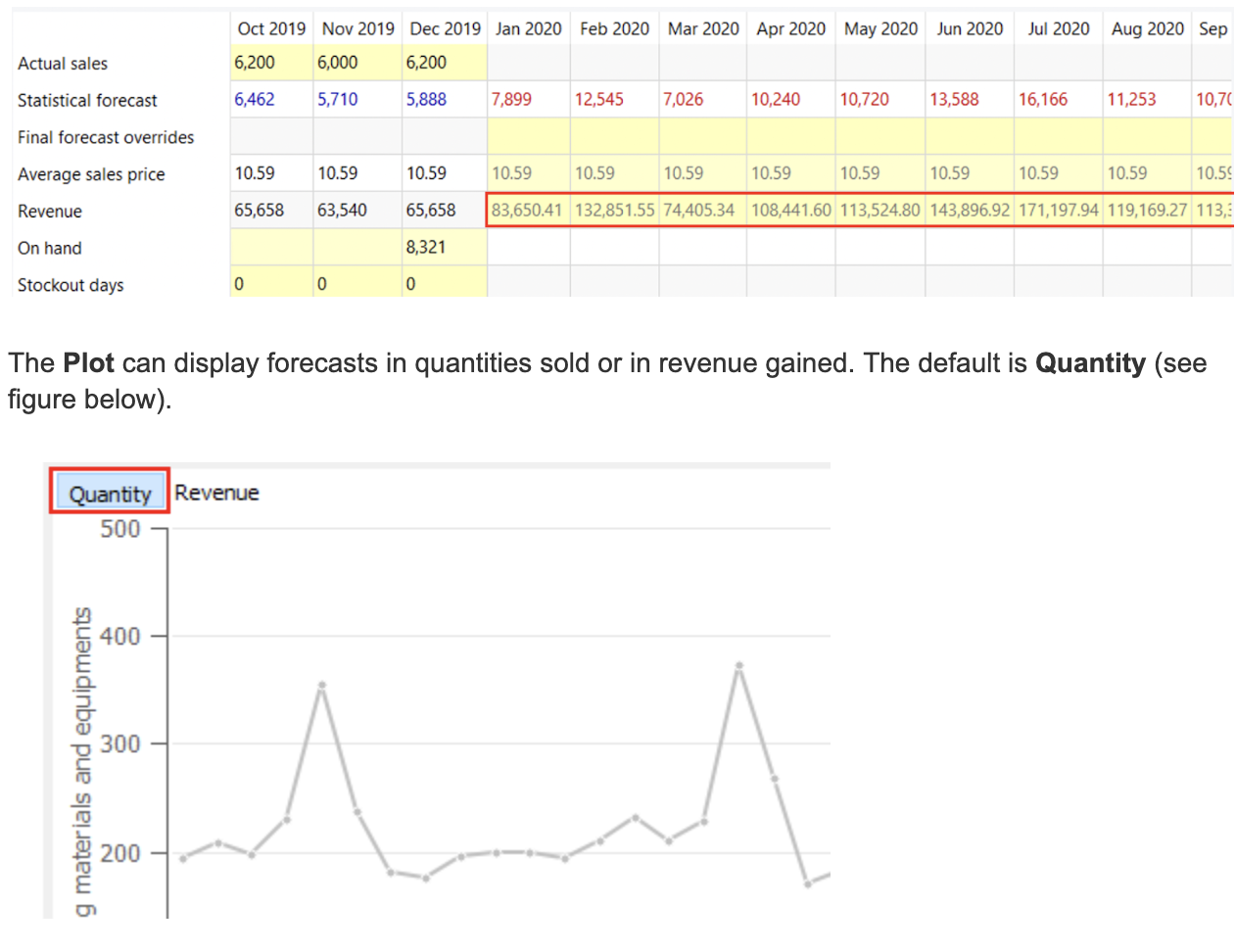 The Plot can display forecasts in quantities sold or in revenue gained. The default is Quantity (see figure below).