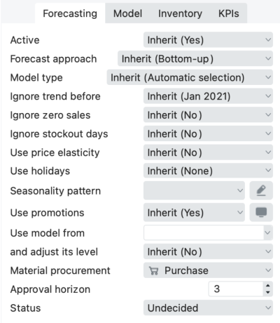 | Price elasticity influence | Use price elasticity | Feature considers not only qty sold in the past to generate a forecast but also notices the connection between an increase or decrease in sales and price change |