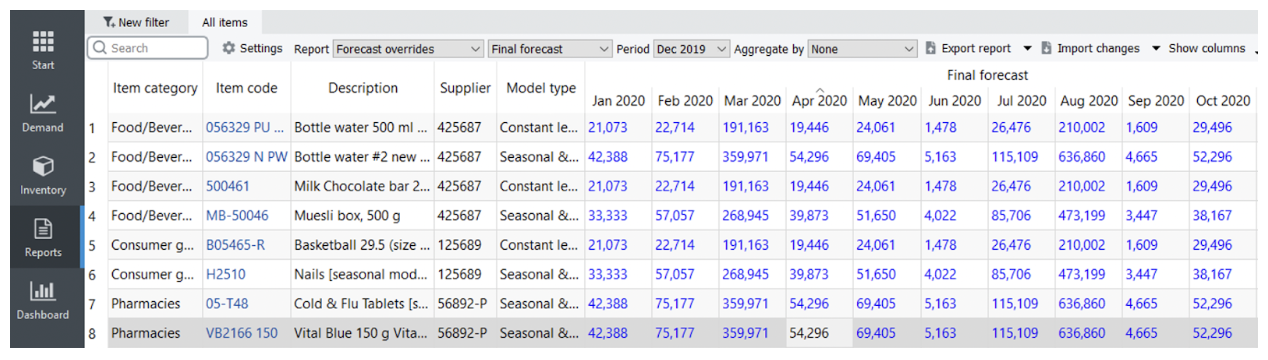 This report shows only the forecast adjustments made manually in the Forecast overrides row of the Table view on the Demand forecasting tab. It is useful when you need to ensure that all the adjustments you intended to do were done.
