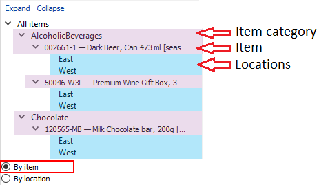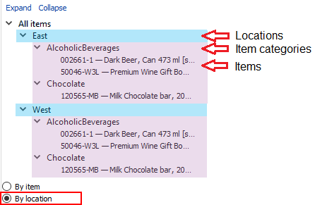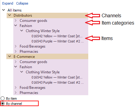 If you import locations or channels additionally to items, the Three view shows two viewing options: