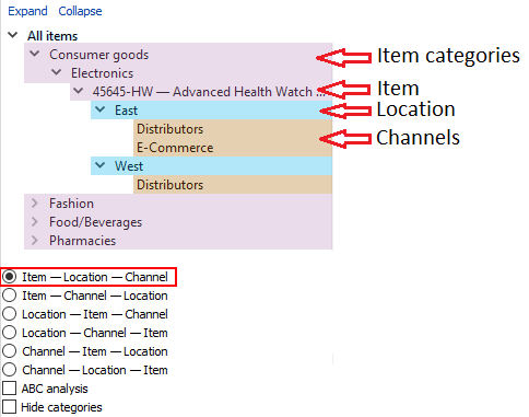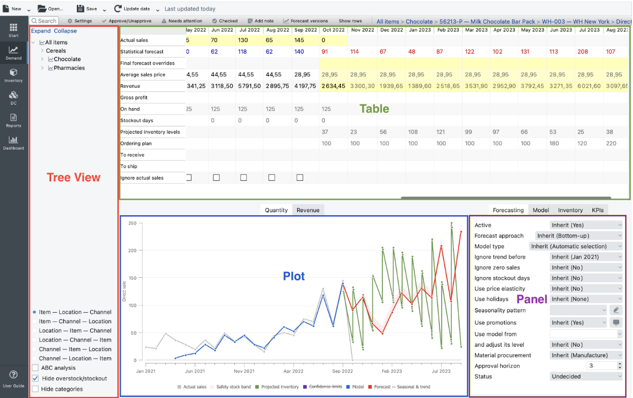 The Tree view on the left is used to browse through your data hierarchy and see the forecasts and other information at a particular level. As soon as you select a node in the tree, the Table, Plot, and Panel get updated immediately and show the corresponding information at that level.