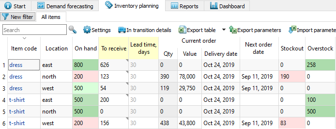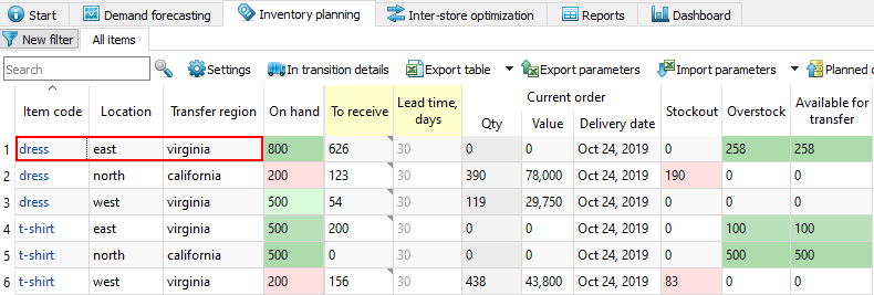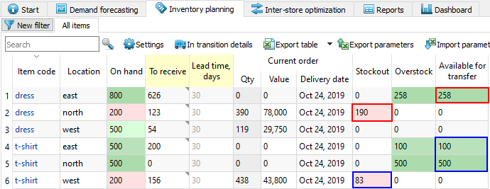 There are overstocks for three planning items, and, at the same time, two items have stockouts. Let's see, if Streamline can restock the required quantities using intersite transfers. By default, the intersite optimization feature is disabled. Let's enable it.