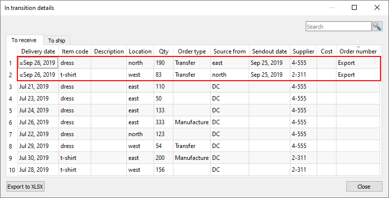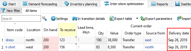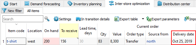 Our example doesn't have a distribution center configured, it contains stores only. The today date is Sep 25, 2019, thus, Streamline determines the delivery date as Sep 26, 2019 and shows it in the Delivery date column (see figure below).