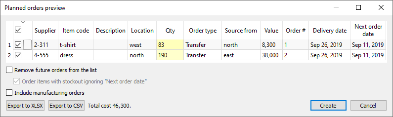 2. Click the Planned orders button found on the toolbar. The Planned orders preview dialog appears (see figure below).