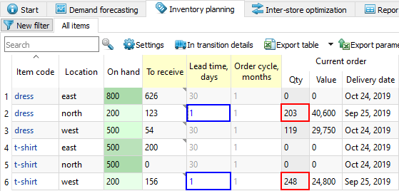 To do this, we go to the Inventory planning tab and set Lead time to 1 day for items with stockouts (see figure below).