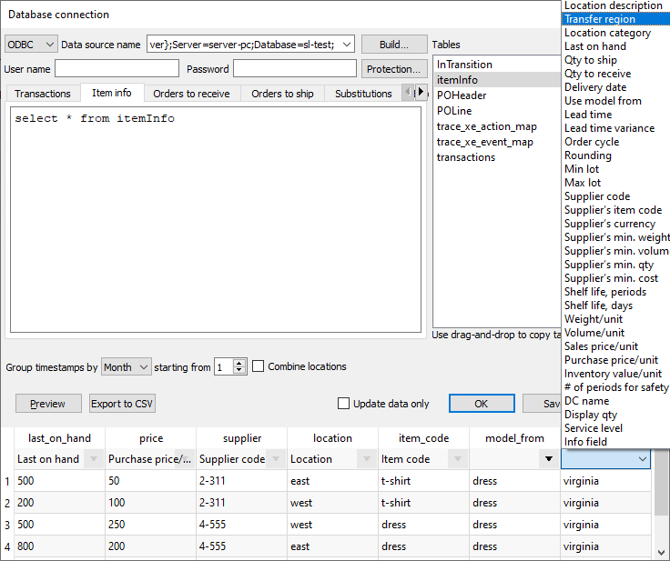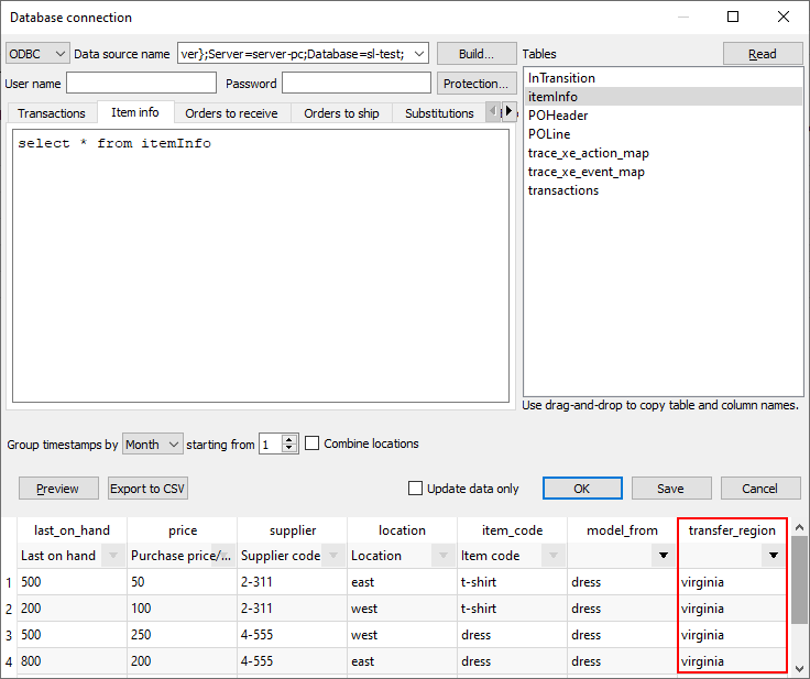 To enable Streamline to put a region constraint on the generated transfers, the Transfer region data type should be configured and imported along with other information about your inventory. To do this, we will reconfigure our connection setting to the database by completing the following steps: