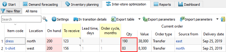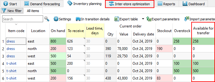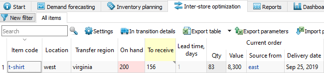 After we click OK, a new column Available for transfer has been added into the Inventory planning tab, and a new tab called Intersite optimization has been added into the set of application tabs (see figure below).