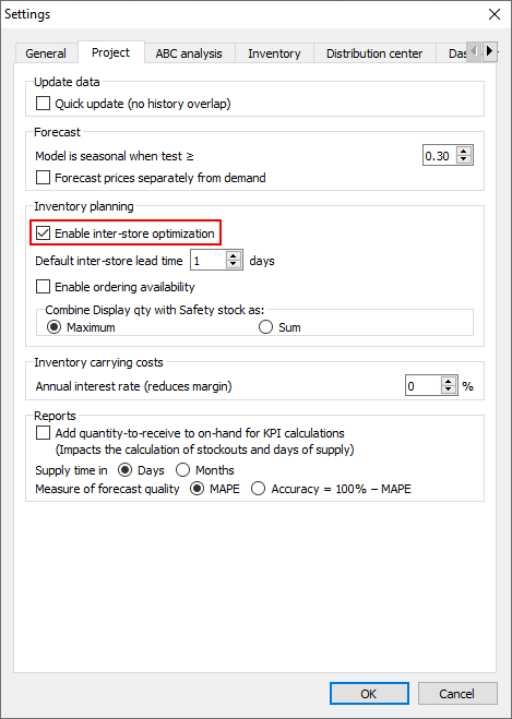 3. Check the option Enable intersite optimization under the Inventory planning group (see figure below).