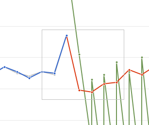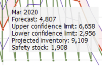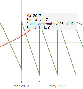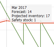 If you import inventory information besides the sales history, the Plot depicts projected inventory levels by a green line. Now the pop-up additionally displays the projected inventory at the end of the period, in the example – at the end of the March 2017.