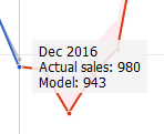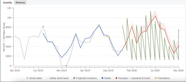 If only sales history was imported, the plot shows the actual sales, models fit, forecast, and the safety stock band. When you hover over a point in the Plot, Streamline shows current time-stamp and numerical values of all the lines which have data at this time point.