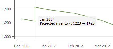 Besides the in-transition arrivals, Streamline shows the projected arrivals in the plot. They have generated automatically by performing multiple replenishment simulations within the forecast horizon. They are always delivered at the end of the period, for example, the 23 to 161 procurement happens on the very last day of the March 2017 (see the figure below).